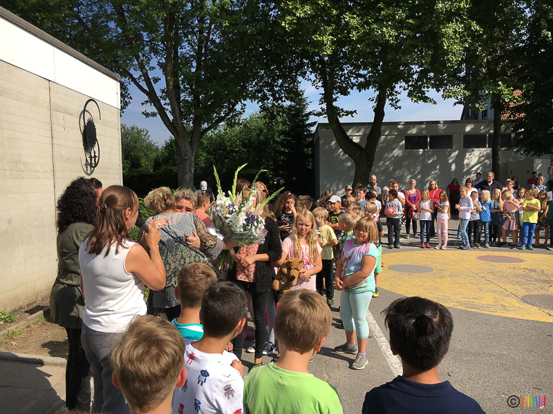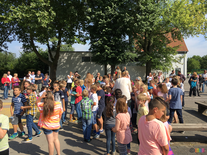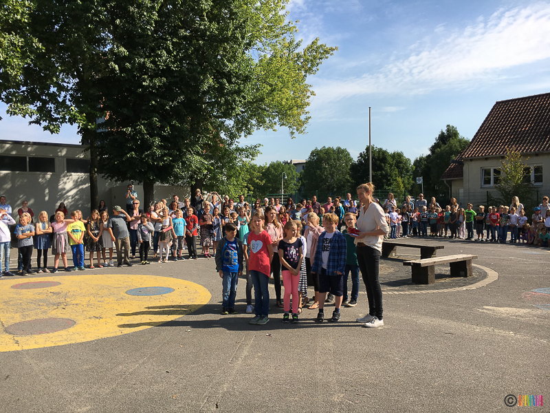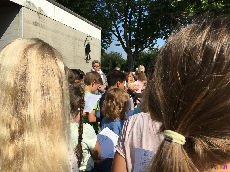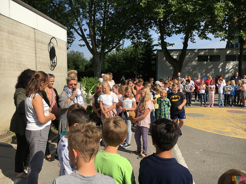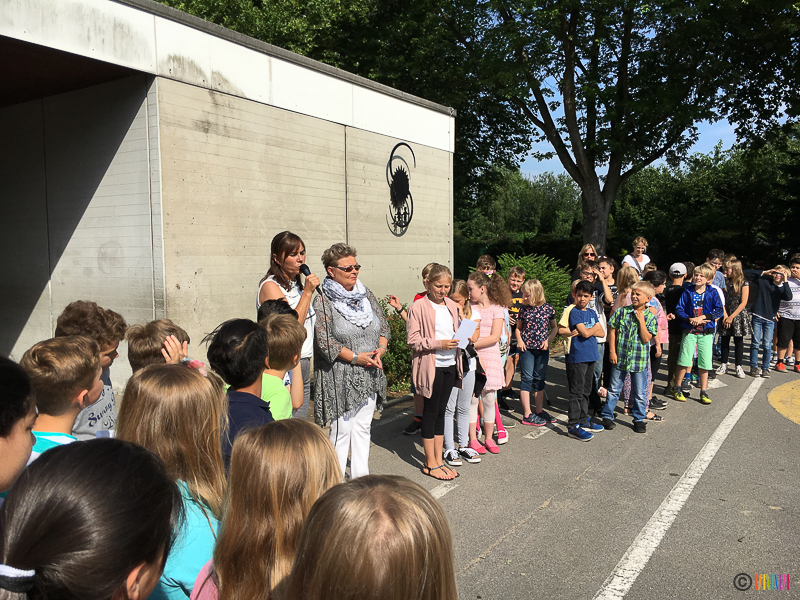 14.07.2017 - Dass uns die "Großen" am Ende eines jeden Schuljahres verlassen, ist nichts Neues. Das ist ganz normal und auch gut, denn alle Kinder der vierten Klassen freuen sich natürlich auch auf das, was kommt, und sind unheimlich gespannt auf ihre neue Schule. Dass wir aber auch traurig sind, bleibt nicht aus. Und aus diesem Grund gab es selbstverständlich auch am letzten Schultag wieder einen Verabschiedungskreis auf dem Selmi-Schulhof mit anschließender Enthüllung der diesjährigen Stelen.