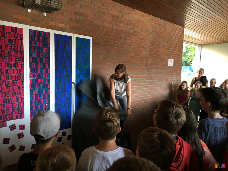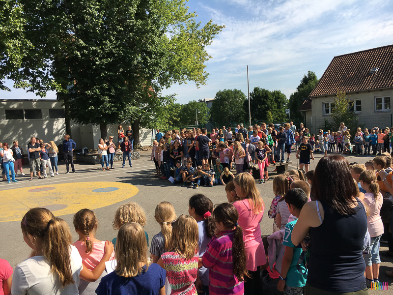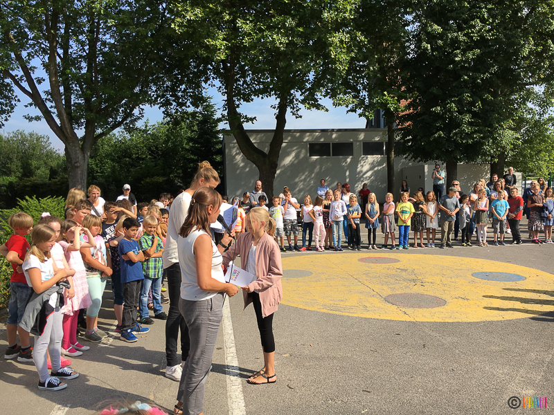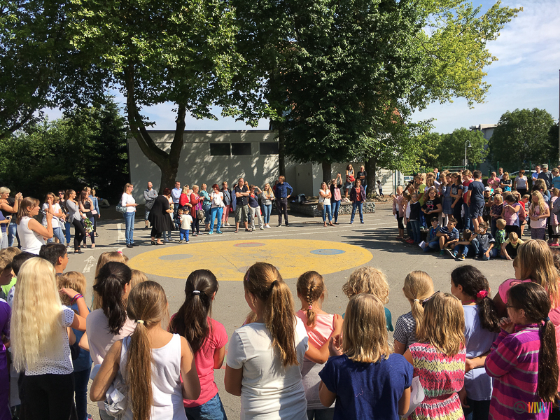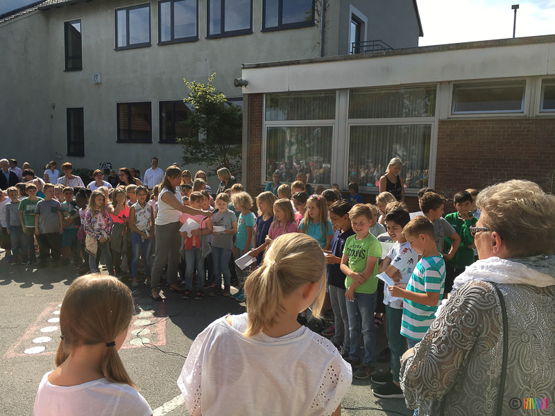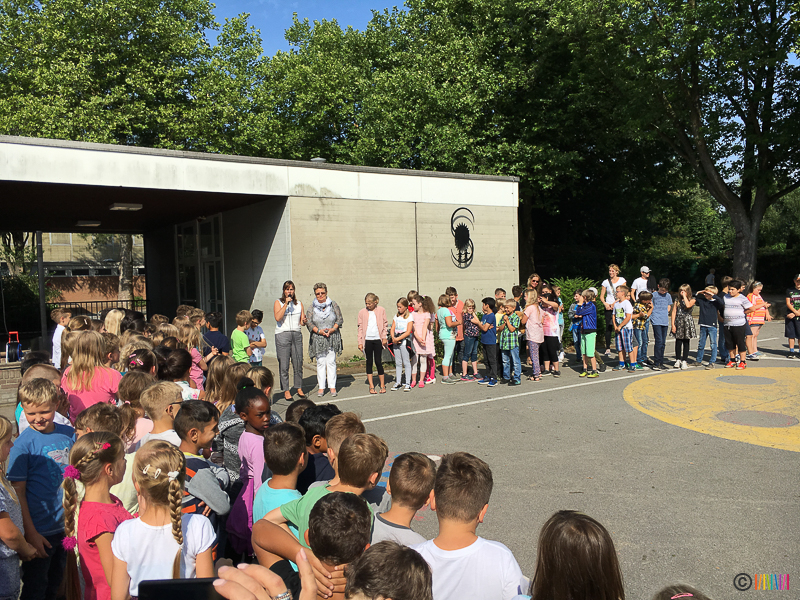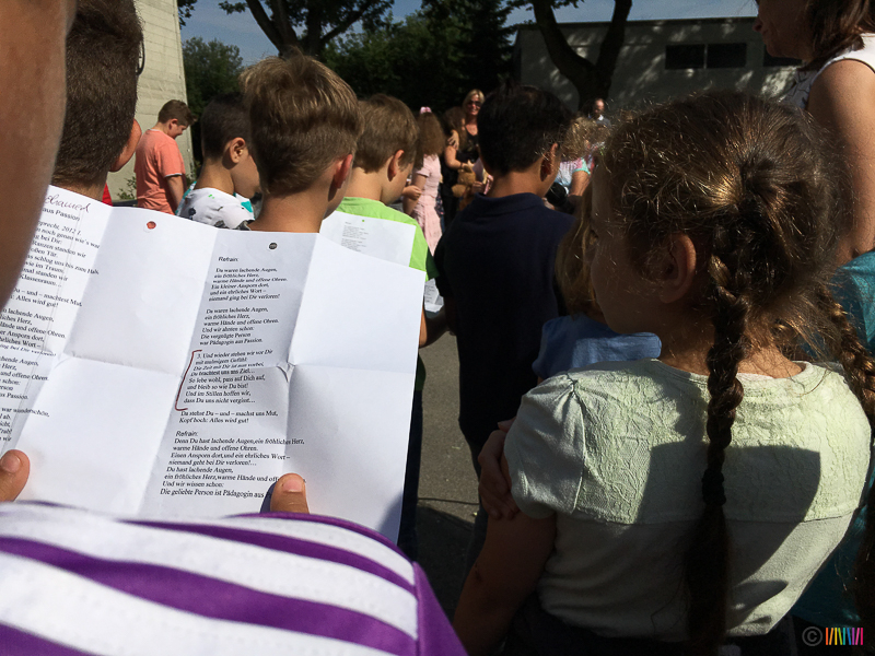 14.07.2017 - Dass uns die "Großen" am Ende eines jeden Schuljahres verlassen, ist nichts Neues. Das ist ganz normal und auch gut, denn alle Kinder der vierten Klassen freuen sich natürlich auch auf das, was kommt, und sind unheimlich gespannt auf ihre neue Schule. Dass wir aber auch traurig sind, bleibt nicht aus. Und aus diesem Grund gab es selbstverständlich auch am letzten Schultag wieder einen Verabschiedungskreis auf dem Selmi-Schulhof mit anschließender Enthüllung der diesjährigen Stelen.