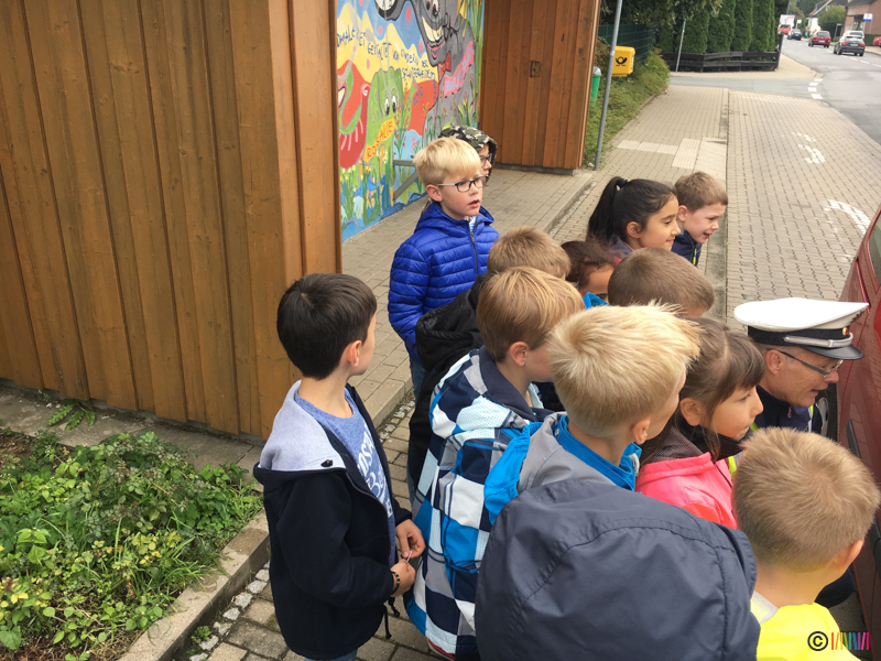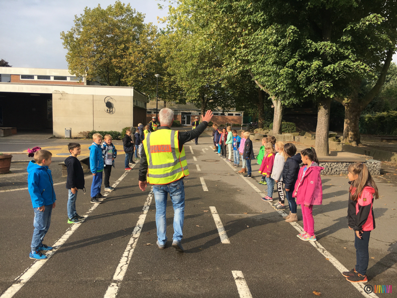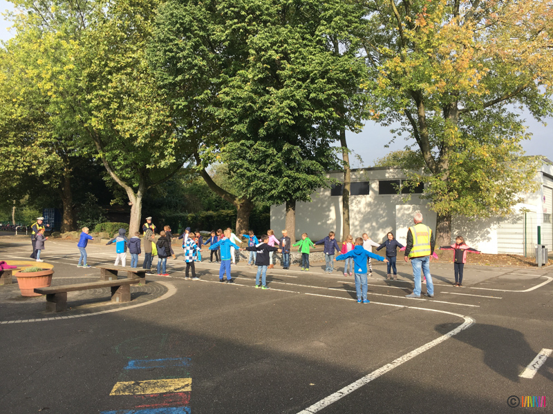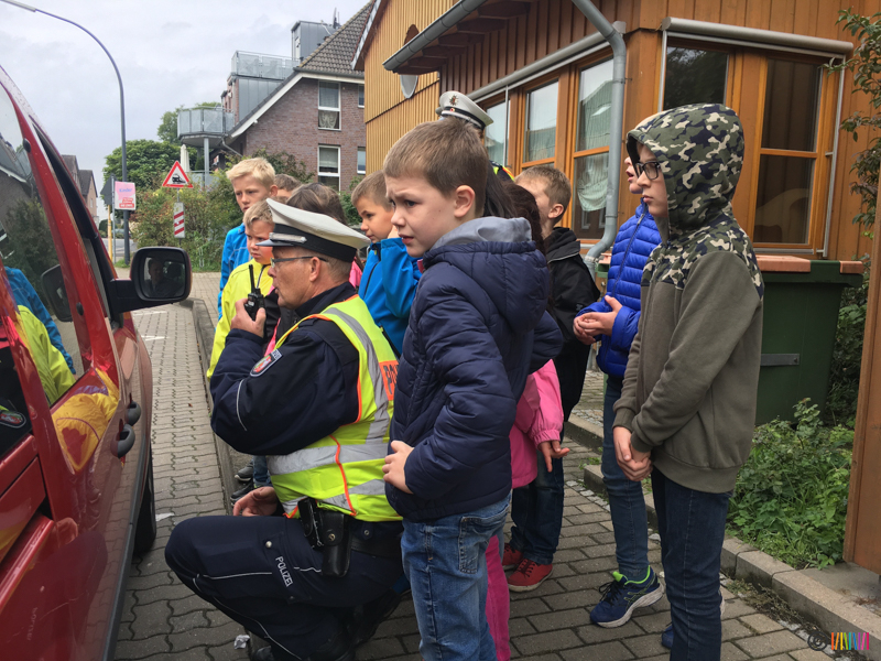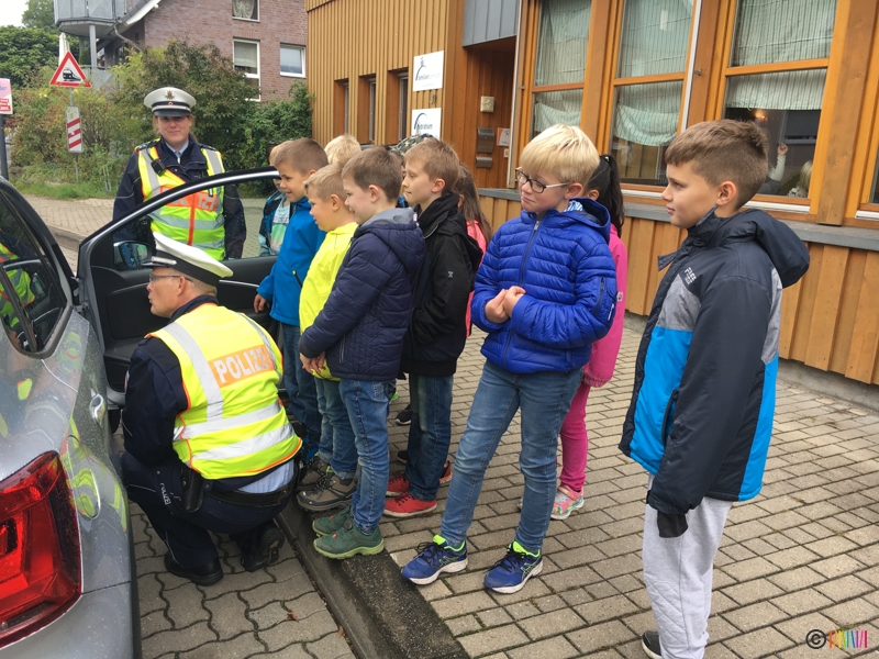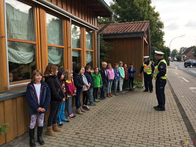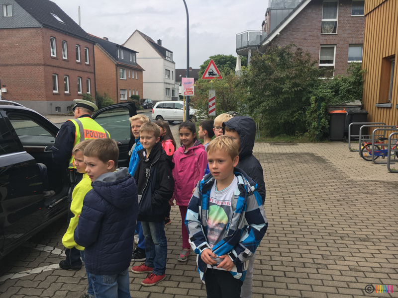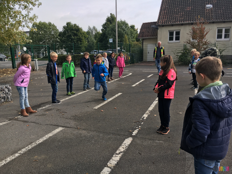 Während der ersten Schulstunden setzten sich die Kinder mit dem Thema "Tempo 30" auseinander. So wurden unterschiedliche Verkehrsbeispiele auf dem Schulhof nachgespielt oder das eigene Verhalten im Straßenverkehr reflektiert. Zudem wurde jede Klasse in zwei Gruppen aufgeteilt. Die eine beobachtete das Tempo der VerkehrsteilnehmerInnen mit Hilfe einer Tempolimit-Tafel, während die andere Gruppe - mehrere 100 Meter weiter - damit beschäftigt war, einige AutofahrerInnen anzuhalten und das Gespräch zu suchen. In kurzen Gesprächen lobten die Kinder das richtige Fahrverhalten der VerkehrsteilnehmerInnen oder machten diese - bei Nicht-Einhalten des Tempolimits - auf mögliche Gefahren aufmerksam. Wir hoffen mit dieser Aktion, dass mit der Unterstützung Aller die Straßen in Wiescherhöfen für unsere Kinder sicherer werden. Ein Dank an dieser Stelle gilt der Polizei, die diese Aktion tatkräftig unterstützte.
