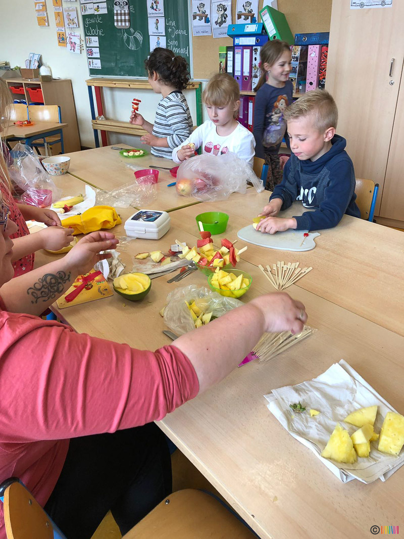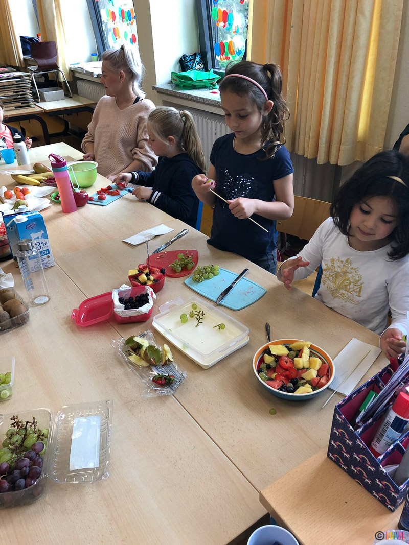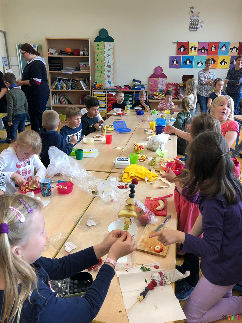 Ganz im Sinne einer gesunden Ernährung wurde in diesem Jahr Quark mit Obst, Smoothies, Obst- und Gemüsespieße hergestellt und ein gesundes Frühstück aufgebaut. Die Landfrauen erklärten allen Kindern wie viel Zucker in welchen Süßspiesen stecken, ließen die Kinder Gemüse sortieren und erstellten Obstspieße. Gut bei den Kindern kam auch der Besuch bei einem Imker an. Gegen Ende der Woche konnten sich alle Kinder nochmals bei einer besonderen Tanzstunde austoben.