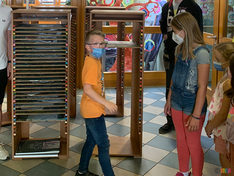 Das Prinzip ist einfach: Die "Trockentürme" ähneln Tablettwagen, wie man sie aus Kantinen oder Restaurants kennt. Nur dass statt der Tabletts sich Bretter in dem Turm befinden, auf die die feuchten Bilder gelegt werden. Das alles ist sauber und platzsparend. Insofern war Schulleiterin Sabine Schillhabel-Henning froh, dass das Projekt realisiert werden konnte. Die "Zukunftsfabrik" habe die Schule schon einige Male unterstützt, verwies sie unter anderem auf die "Mobile Bücherei". Verantwortlich für das aktuelle Projekt zeigten sich die Abteilung Pro Integration und Projektleiter Thorsten Denker.