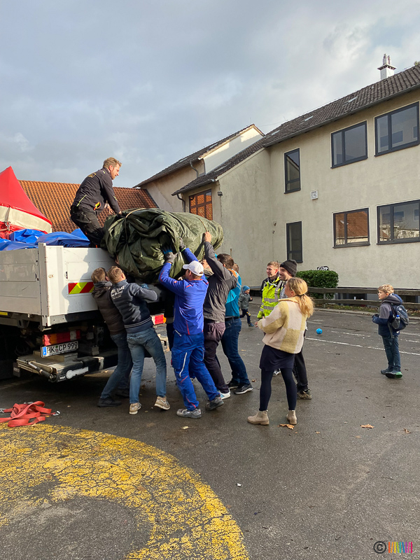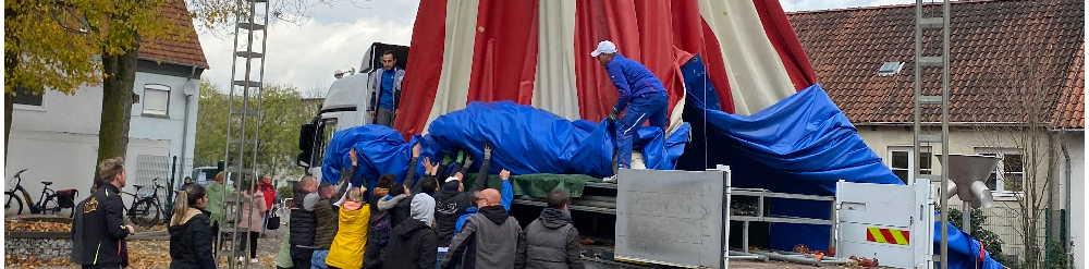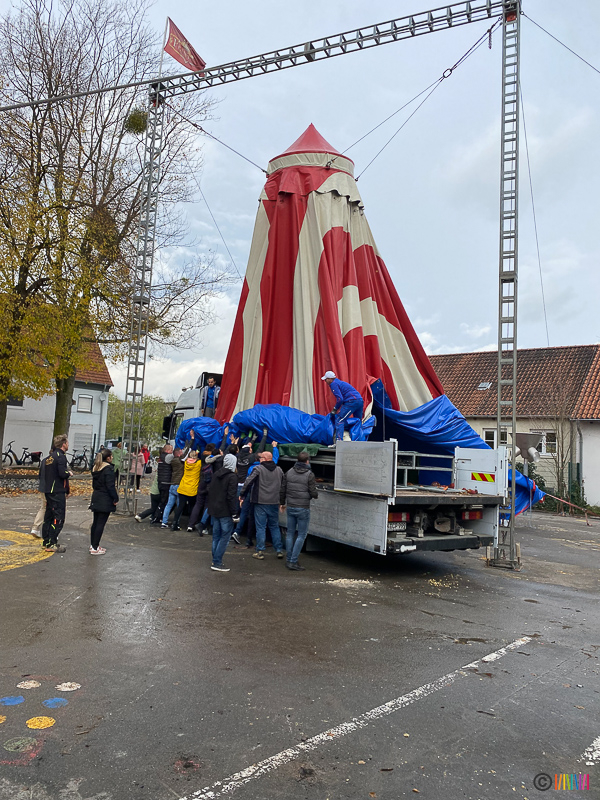11.11.2023 - Es war wunderschön! Nachdem auch die letzte Galavorstellung zuende ging, trafen sich die fleißigen Helferinnen und Helfer auf dem Schulhof der Selmi. Diesmal hieß es: „Abbau des Zirkuszeltes!“ Genau wie schon beim Aufbau des Zirkuszeltes eine Woche zuvor, ging die Arbeit unter der fachkundigen Anleitung des "Circus Phantasia" zügig voran. Mit vereinten Kräften wurde alles wieder verpackt und verstaut.